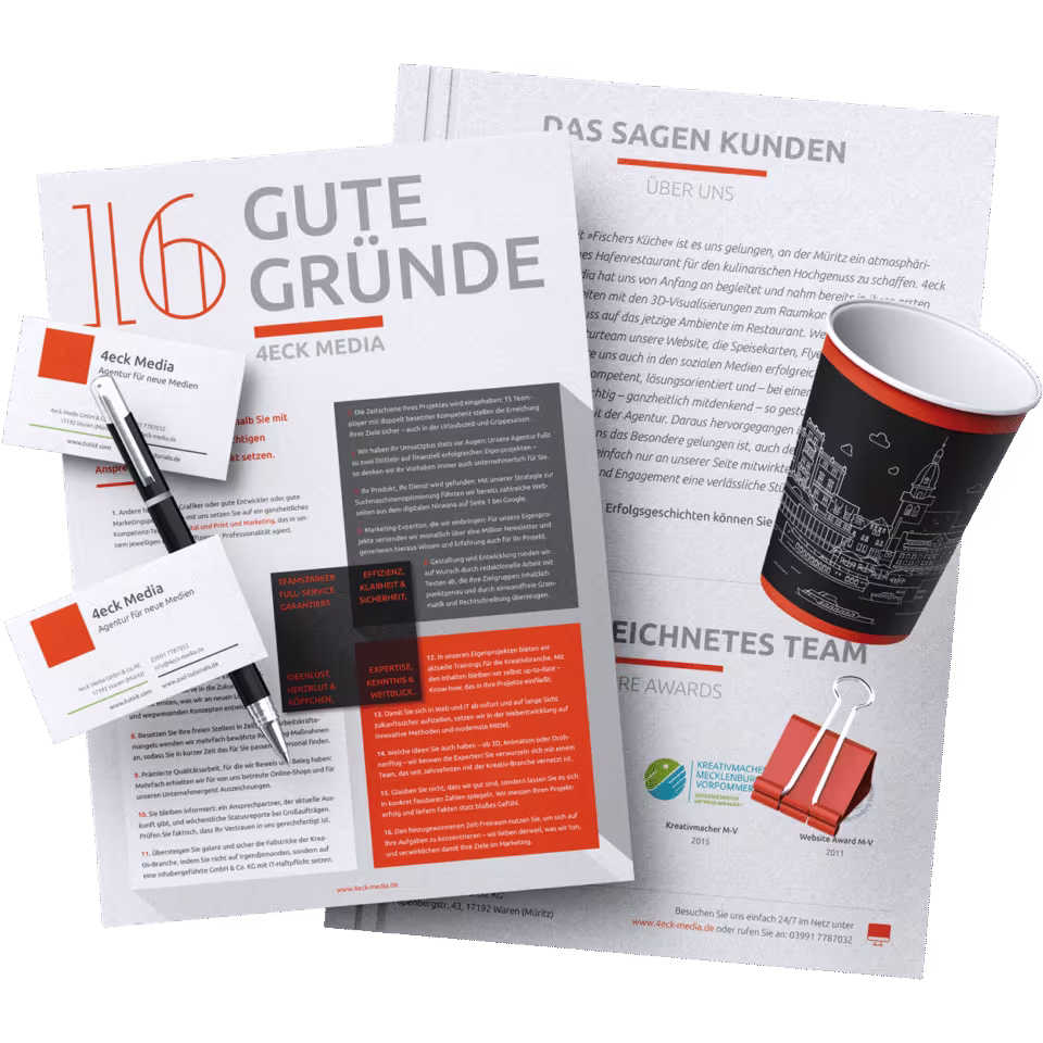 Ob Print oder Web, ob Geschäftsausstattung oder E-Commerce: Lassen Sie sich von Profis betreuen. Freuen Sie sich über eine fokussierte, mitdenkende Zusammenarbeit. Und messen Sie den Erfolg in Kennzahlen wie einer höheren Online-Sichtbarkeit, mehr Anfragen und Bewerbungen dank schärferem Markenprofil, schnelleren Websites und stärkeren Umsätzen im Online-Shop.